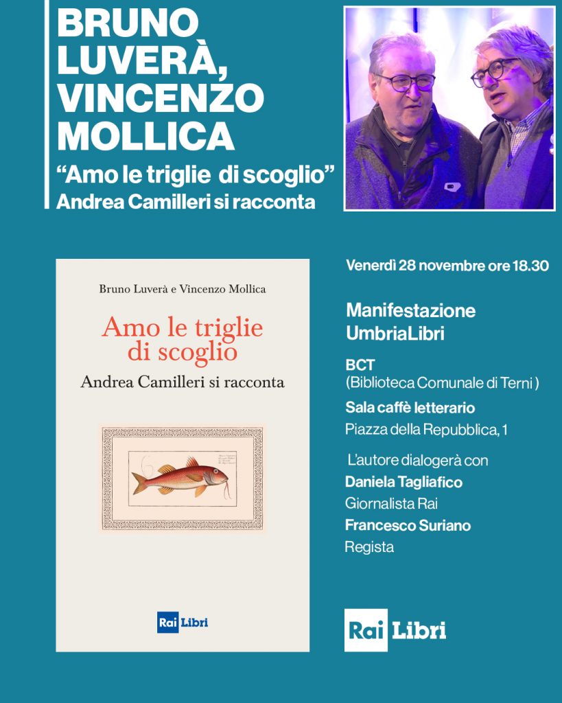 Venerdì 28 novembre alle ore 18.30, presso il Caffè Letterario BCT (Piazza Repubblica 1 a Terni), Umbria Libri ospita la presentazione di “Amo le triglie di scoglio. Andrea Camilleri si racconta” di Bruno Luverà e Vincenzo Mollica (Rai Libri). A dialogare con Bruno Luverà saranno Daniela Tagliafico e Arianna Mortelliti. In collegamento, Vincenzo Mollica. Il volume è il romanzo di una vita del più letto scrittore italiano, per trent’anni in Rai. “Amo le triglie di scoglio” è un racconto che Camilleri ricompone, attraverso il mosaico degli incontri con i due giornalisti. Dai nastri riemergono parole, sorrisi, silenzi, capitoli di una storia personale che diventa spunto per un’autobiografia della nazione.