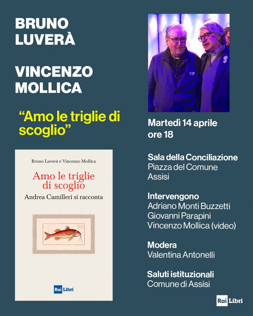 Martedì 14 aprile alle ore 18 si terrà ad Assisi (Sala della Conciliazione, piazza del Comune) la presentazione del volume di Rai Libri “Amo le triglie di scoglio-Andrea Camilleri si racconta” di Bruno Luverà e Vincenzo Mollica, in collaborazione con la sede Rai dell’Umbria nell’ambito degli Screenings 2026 di Rai Com. All’incontro con il pubblico, occasione per ripercorrere tra aneddoti e curiosità la vita e il mondo del creatore del Commissario Montalbano, prendono parte Bruno Luverà, il direttore della sede Rai dell’Umbria, Giovanni Parapini e il direttore di Rai Libri Adriano Monti Buzzetti, con l’intervento video di Vincenzo Mollica. Previsto un saluto istituzionale da parte del Comune di Assisi. Gli Screenings di Rai Com sono realizzati in collaborazione con la Regione Umbria e con la collaborazione e il supporto organizzativo del Comune di Assisi.