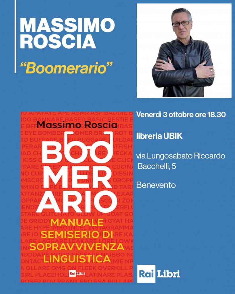 Venerdì 3 ottobre alle ore 18.30 Massimo Roscia presenta “Boomerario. Manuale semiserio di sopravvivenza linguistica” a Benevento. A ospitare l’incontro con il pubblico, la libreria UBIK (Via Lungosabato Riccardo Bacchelli, 5). Il volume è un prontuario, una bussola, un decodificatore, utile e divertente, per conoscere meglio i giovani d’oggi.