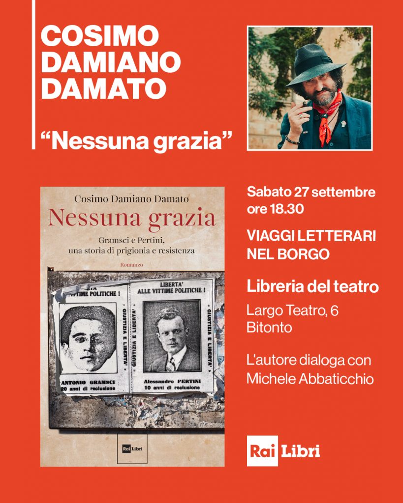 Sabato 27 settembre alle ore 18.30 Cosimo Damiano Damato presenta “Nessuna grazia. Gramsci e Pertini, una storia di prigionia e resistenza” a Bitonto (Libreria del Teatro, Largo Teatro 6). A dialogare con l’autore, Michele Abbaticchio. Un romanzo storico che racconta l’incontro, dietro le sbarre, del futuro combattente nella Resistenza e più amato Presidente della Repubblica italiana, Sandro Pertini, con l’onorevole comunista Antonio Gramsci, fondatore del Partito Comunista Italiano e filosofo. Il carcere, la violenza, ma anche una storia di dignità e coraggio, di lotta per la libertà e profonda amicizia di due grandi uomini italiani del Novecento.
