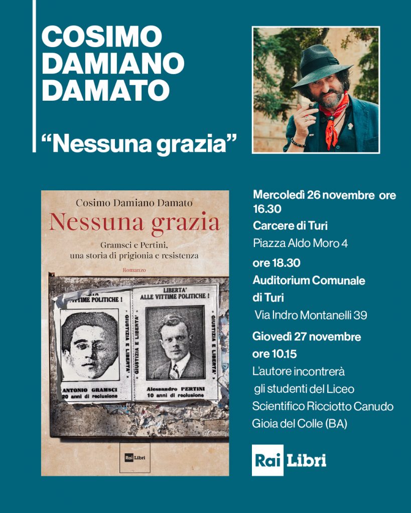 Una storia di dignità e coraggio, lotta per la libertà e profonda amicizia di due grandi uomini italiani del Novecento. Cosimo Damiano Damato presenta “Nessuna Grazia. Gramsci e Pertini, una storia di prigionia e resistenza” (Rai Libri) mercoledì 26 novembre alle ore 16.30 al Carcere di Turi (Piazza Aldo Moro 4) e alle 18.30 all’Auditorium Comunale di Turi (Via Indro Montanelli 39). Giovedì 27 novembre alle 10.15 l’autore incontrerà invece gli studenti del Liceo Scientifico Ricciotto Canudo a Gioia del Colle. Le iniziative sono nell’ambito del Festival del Libro Possibile Winter.
