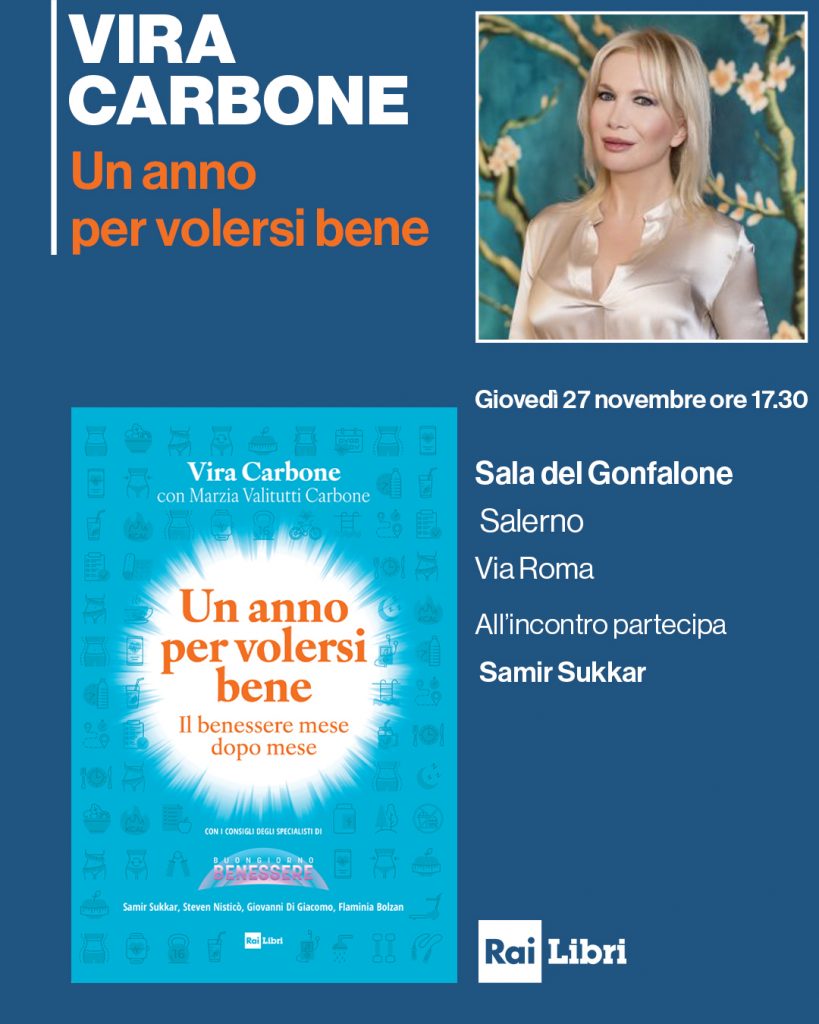 Il benessere mese dopo mese nel nuovo libro di Vira Carbone “Un anno per volersi bene”. Il volume, scritto con Marzia Valitutti Carbone, sarà presentato dall’autrice giovedì 27 novembre alle ore 17.30 nella Sala del Gonfalone a Salerno (via Roma). All’incontro prenderà parte Samir Sukkar. Il libro accompagna le lettrici e i lettori in un percorso gradua­le e stagionale all’insegna di alimentazio­ne equilibrata, movimento dolce, benesse­re emotivo e piccole routine quotidiane.